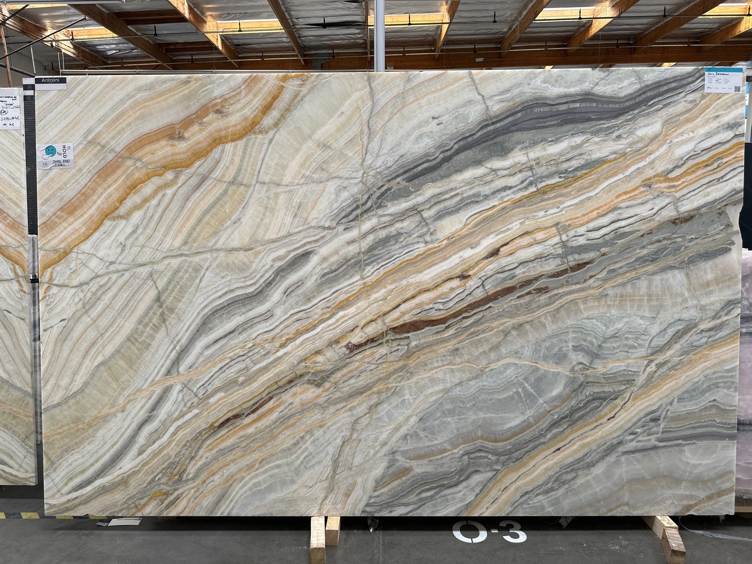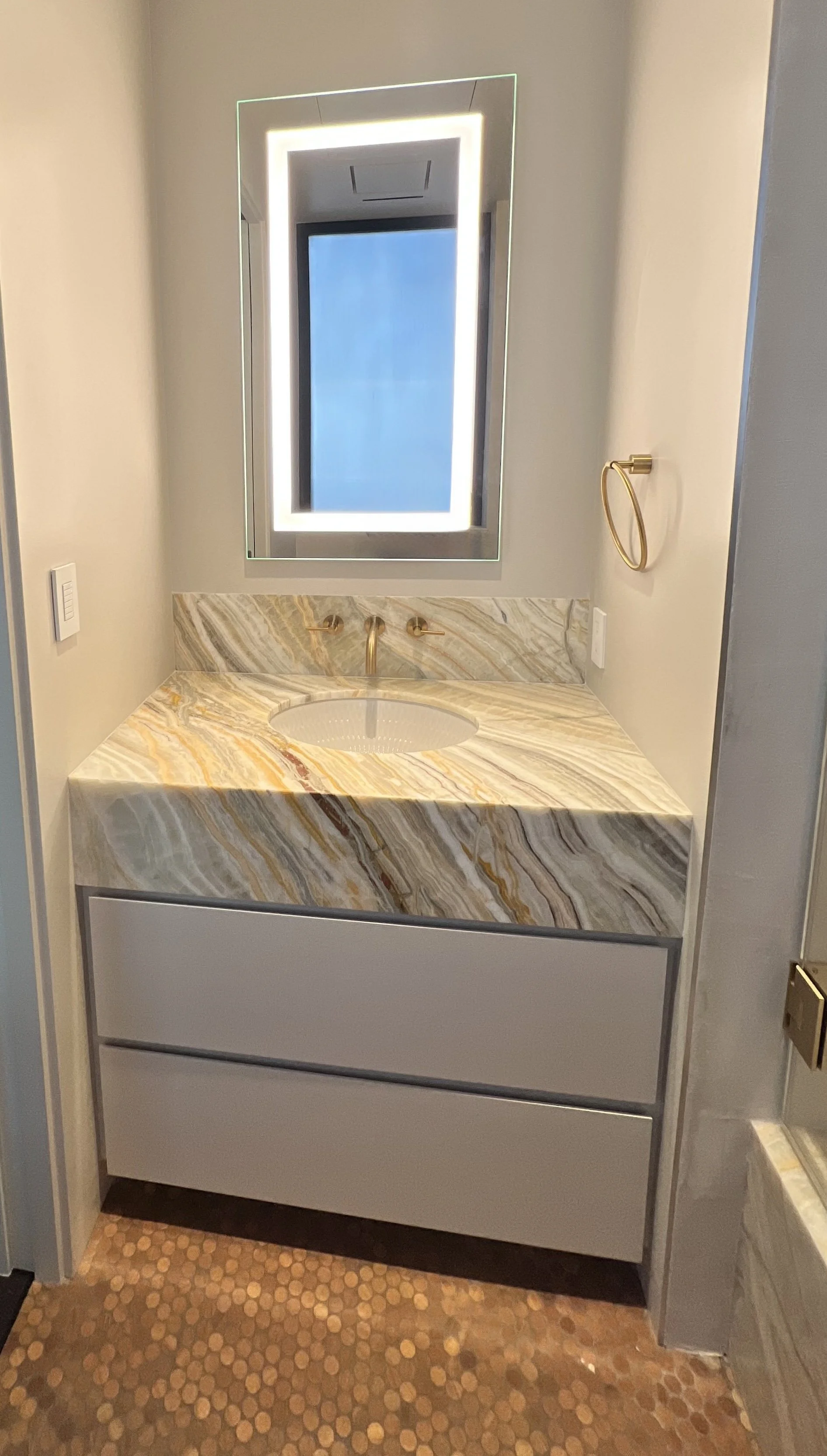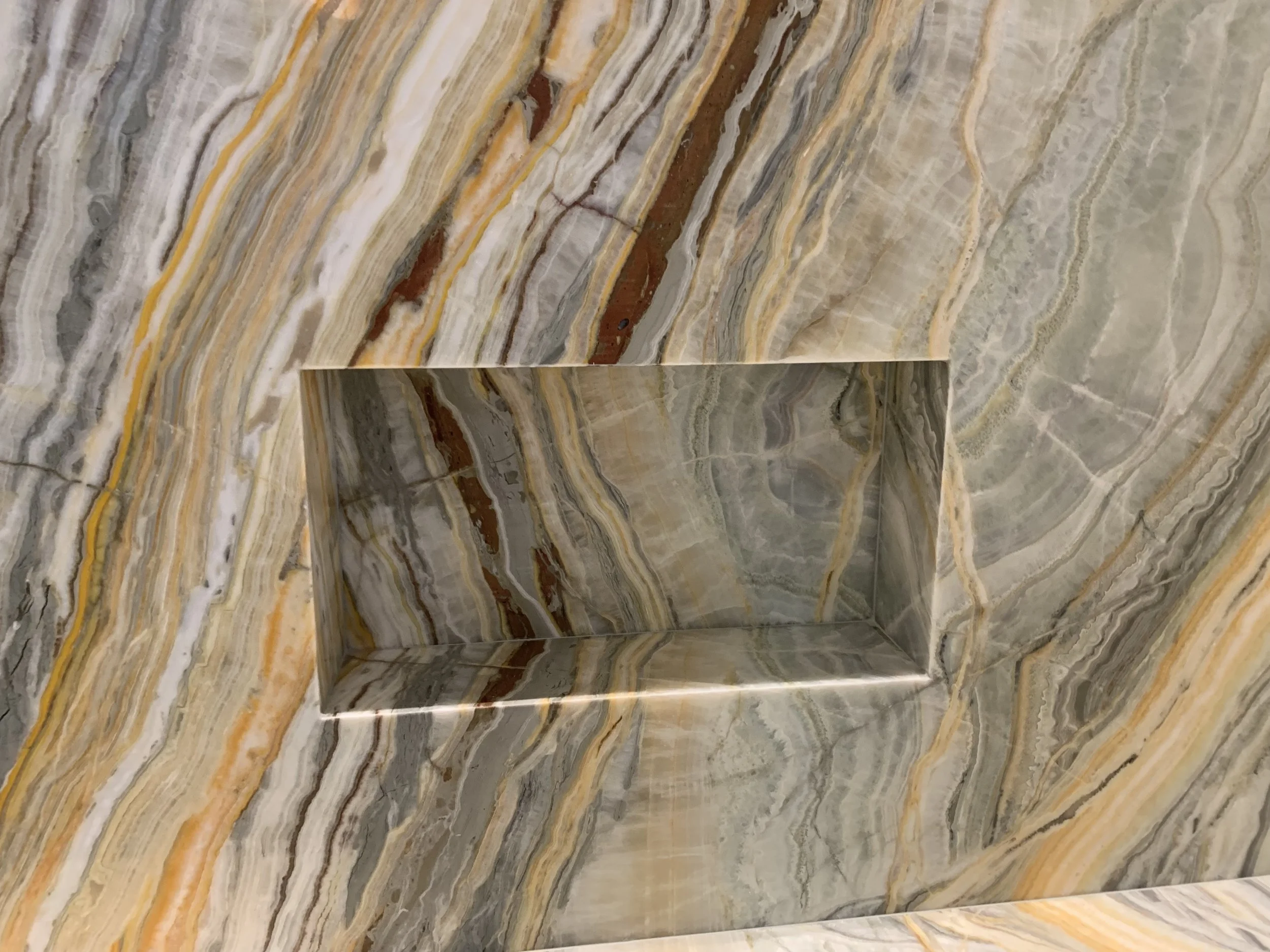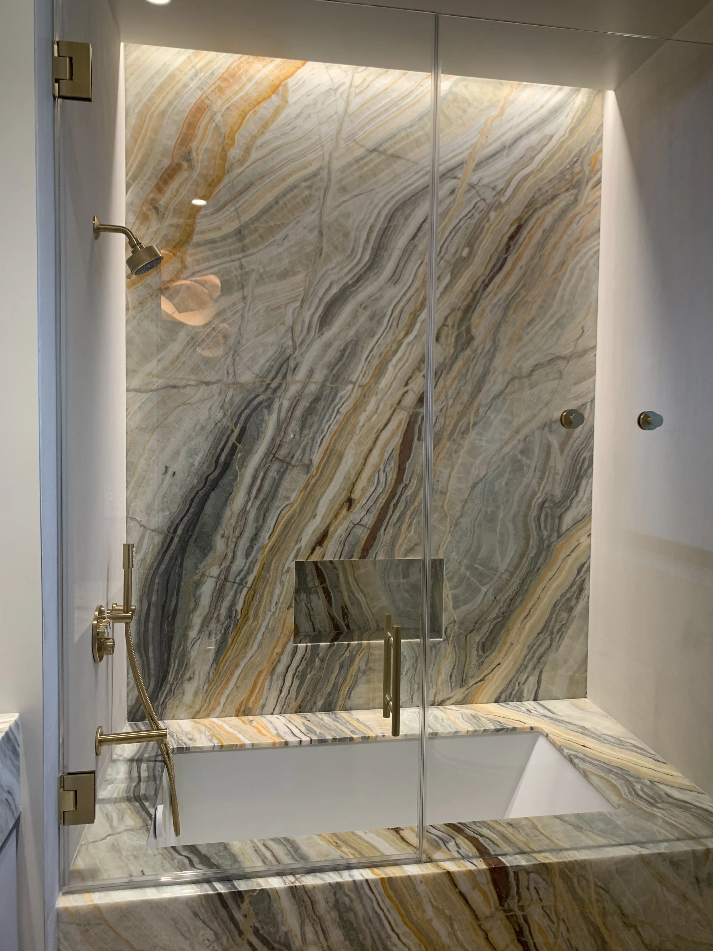 The focal point of the bathroom is Marble Unlimited’s Onyx Rainbow polished slab. The heavily veined marble features sweeping organic striations that add movement and a layer of depth to the slab. Distinctive onyx, amber and gold tones stand out from soft gray, warm taupe and cream hues. Installed at full height, the material extends seamlessly from the back wall to the tub deck, reinforcing a sense of cohesion and quiet luxury. The frameless glass enclosure preserves the openness of the alcove and allows the stone to remain the focal point. A niche and ample shelving around the tub provide room for bath products making it functional and stylish. Warm brushed brass finishes add refinement and compliment the jewel tones of the veining.