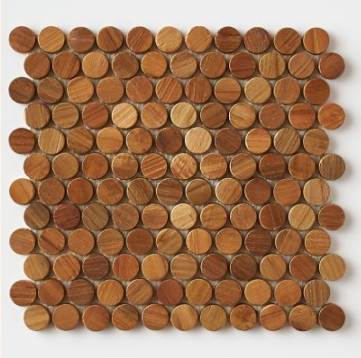 Complimenting the colors is Indoteak’s pennyround mosaic flooring, crafted from reclaimed teak. The water-resistant flooring has an organic feel and timeless style.
